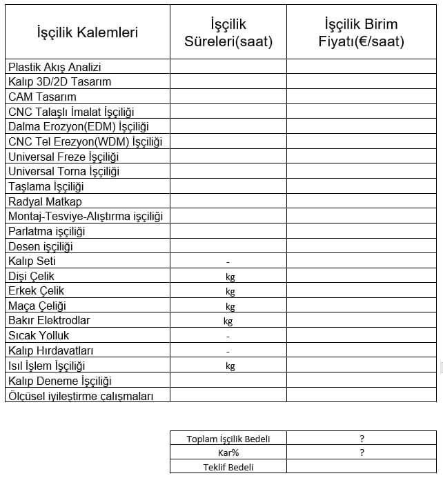 Tüm bu sayılan noktalar montaj, tesviye, talaşlı imalat, CAD/CAM, hırdavat, çelik vb maliyetleri etkilediği için her bir kalıp imalatçısı farklı öngörülerde bulunarak size bir fiyat sunmaktadır. Bu nedenle her imalatçı ile aynı plastik kalıp taslağını konuşursanız aradaki fiyat farkları görüştüğünüz firmaların saatlik işçilik farkını ortaya koyacaktır. Örneğin talaşlı imalat için bir firma 20 TL/Saat fiyat verebiliyorken, diğer bir firma 20 €/Saat fiyat verebilir. Bu da yapılan işin kalitesine, kalifiye işçiliğe ve kullanılan tezgahın kalitesine göre belirlenmektedir. Örneğin Taiwan menşeli bir CNC İşleme merkezi ile Alman menşeli bir CNC İşleme merkezinin saatlik ücretinin farklı olması çok doğaldır.